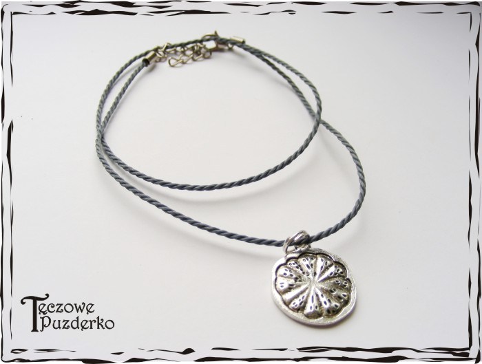 Prosty naszyjnik. Na bawełnianym szarym sznurku jubilerskim została umieszczona niewielka,okrągła zawieszka w kolorze starego srebra przywodząca na myśl pachnący cytrusowy owoc.