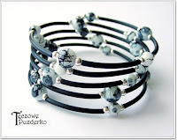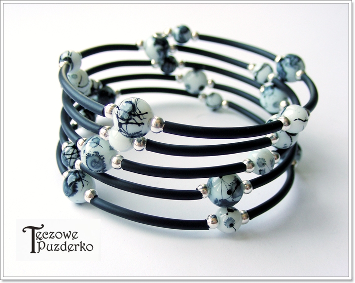 Biało-czarny Twist czyli bransoletka wykonana na bazie drutu pamięciowego. Szklane, malowane koraliki w oryginalne wzory poprzeplatane zostały odcinkami czarnego kauczuku.