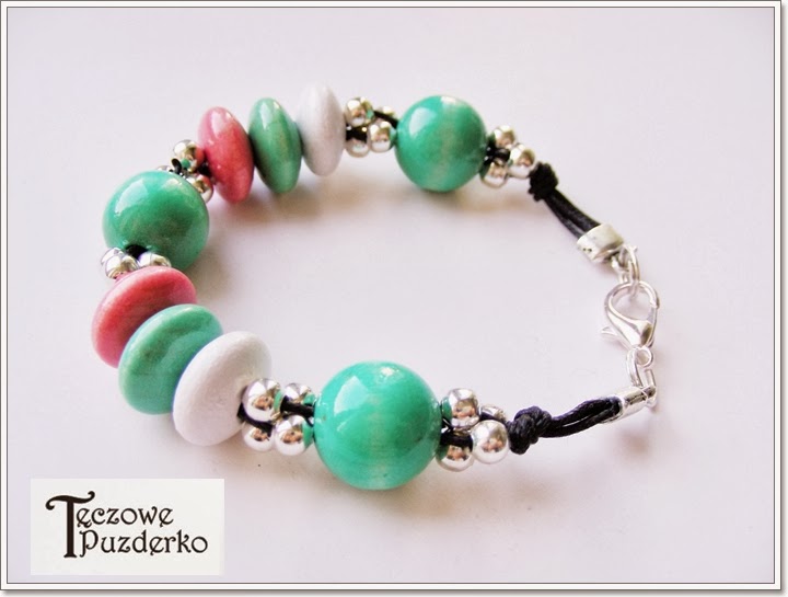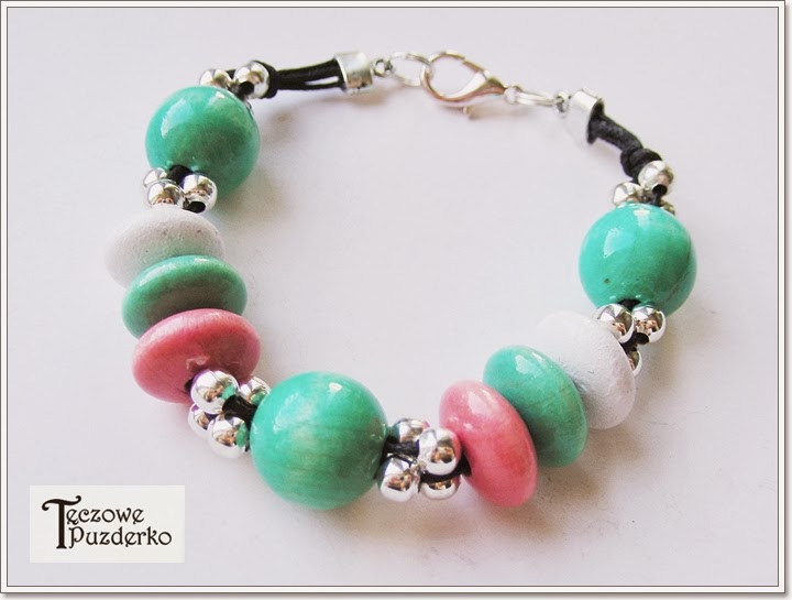 Bransoletka wykonana z drewnianych, lakierowanych koralików w landynkowo-miętowych kolorach. Całość na czarnym, woskowanym sznurku jubilerskim. Wykończenie w kolorze srebrnym.