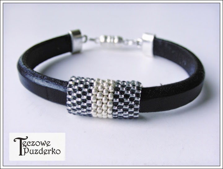 Bransoletka z czarnego, lakierowanego rzemienia ozdobiona siateczką wykonaną ściegiem peyote z koralików Toho 11/0. Końcówki i zapięcie magnetyczne w kolorze srebrnym.